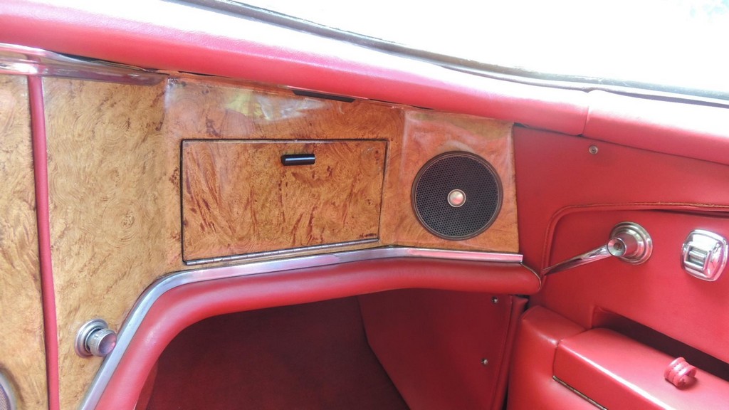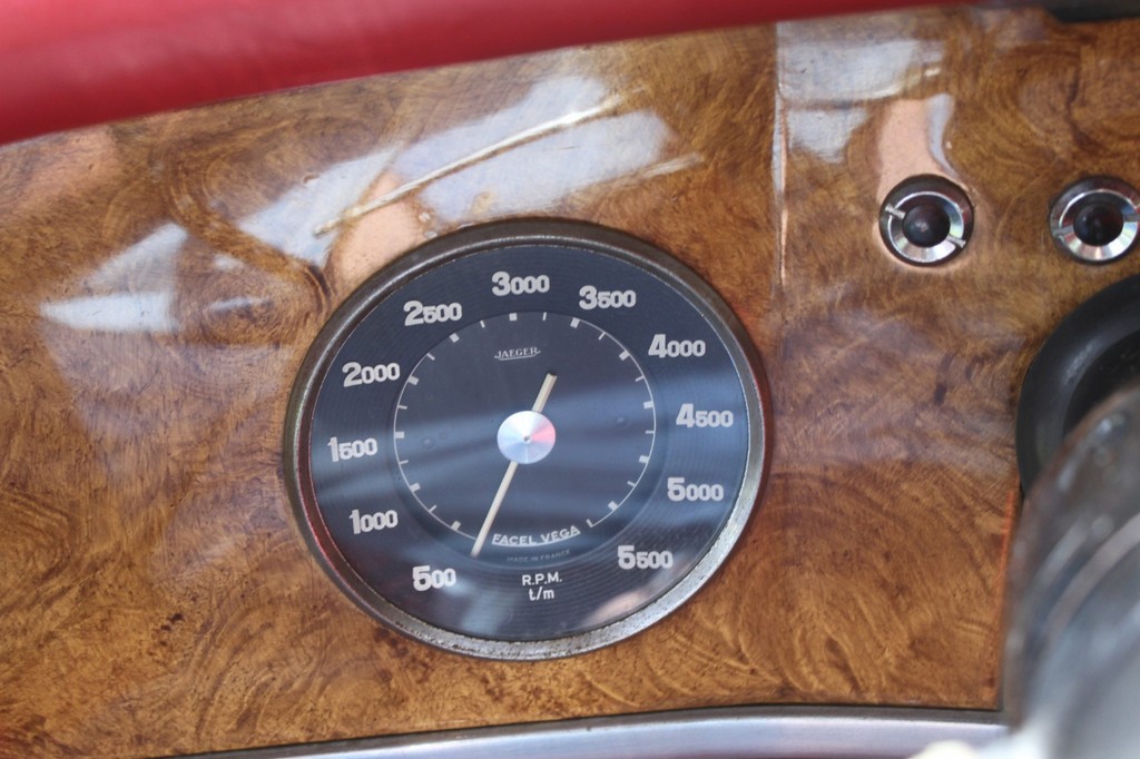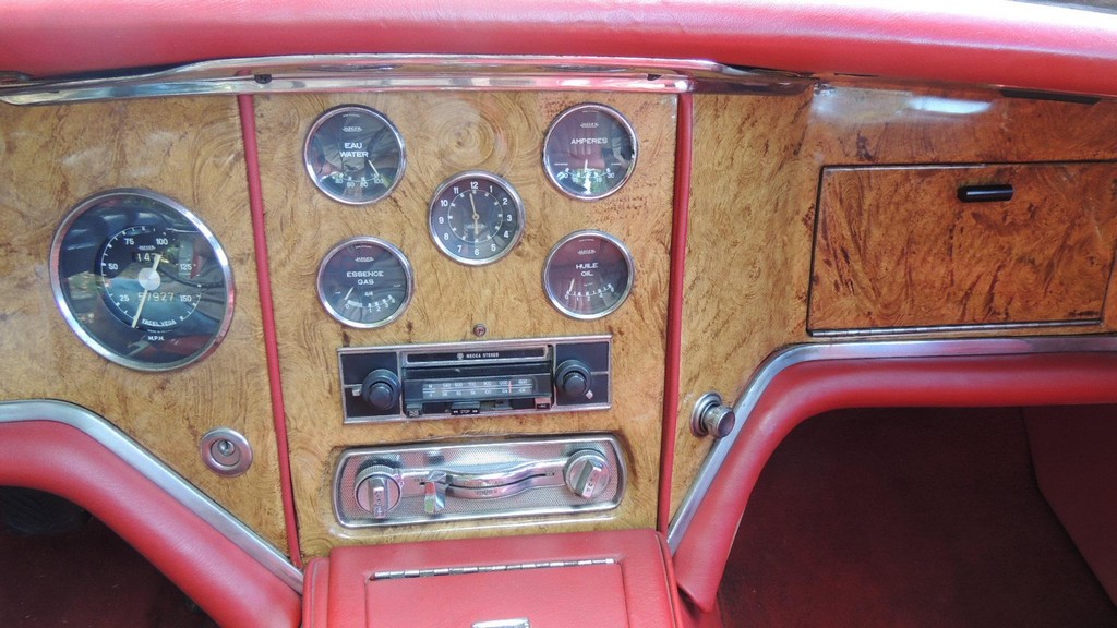 The interior showcases rich red leather upholstery, creating a striking contrast against the exterior and highlighting the car’s bespoke luxury. A hand-painted dashboard—a Facel Vega signature—anchors the cabin, complemented by power windows and a period-style cassette stereo that blends vintage charm with subtle convenience. Every detail reflects the marque’s commitment to craftsmanship and exclusivity.