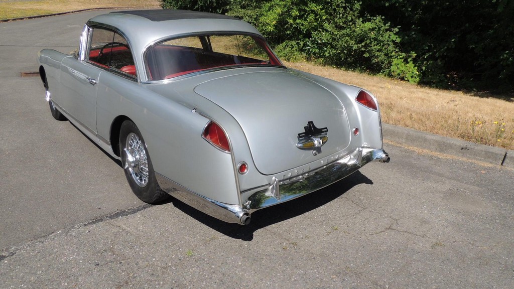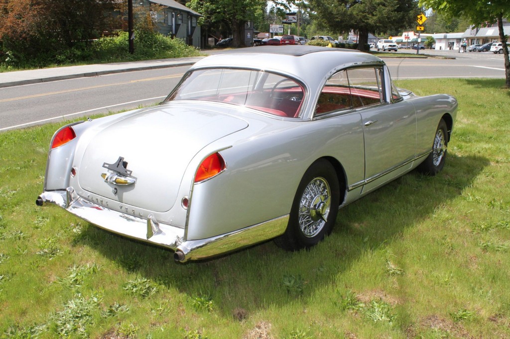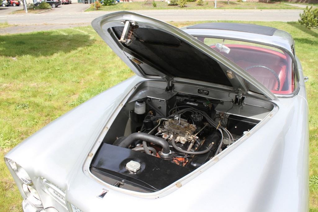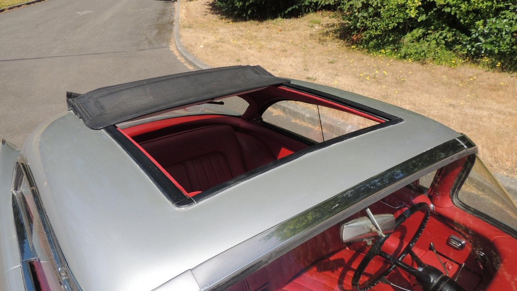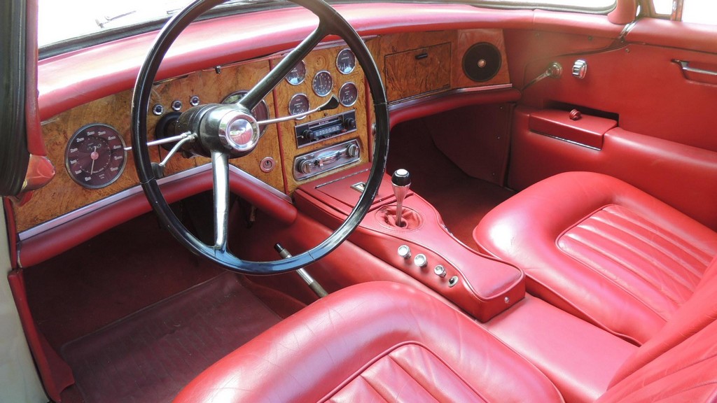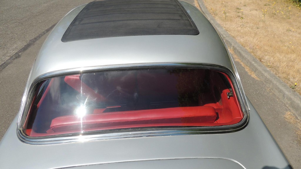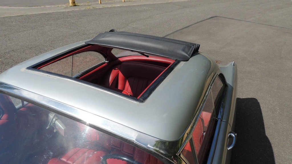 Finished in elegant gray, the coupe’s dramatic presence is defined by its wrap-around windshield, pillarless side glass, and sculpted body lines that embody mid-century European design. Knock-off wire wheels add a sporting touch, while the retractable sunroof enhances the grand touring experience with open-air versatility. Classic drum brakes reflect the car’s period-correct engineering.