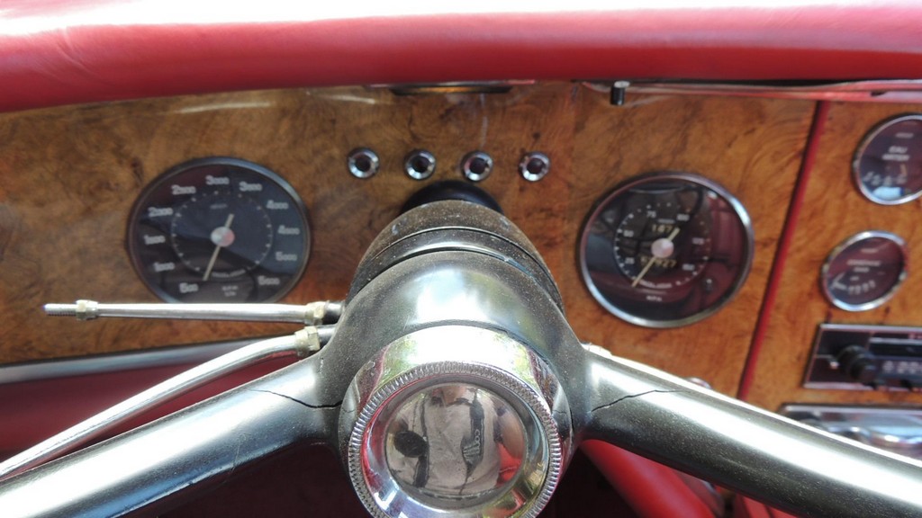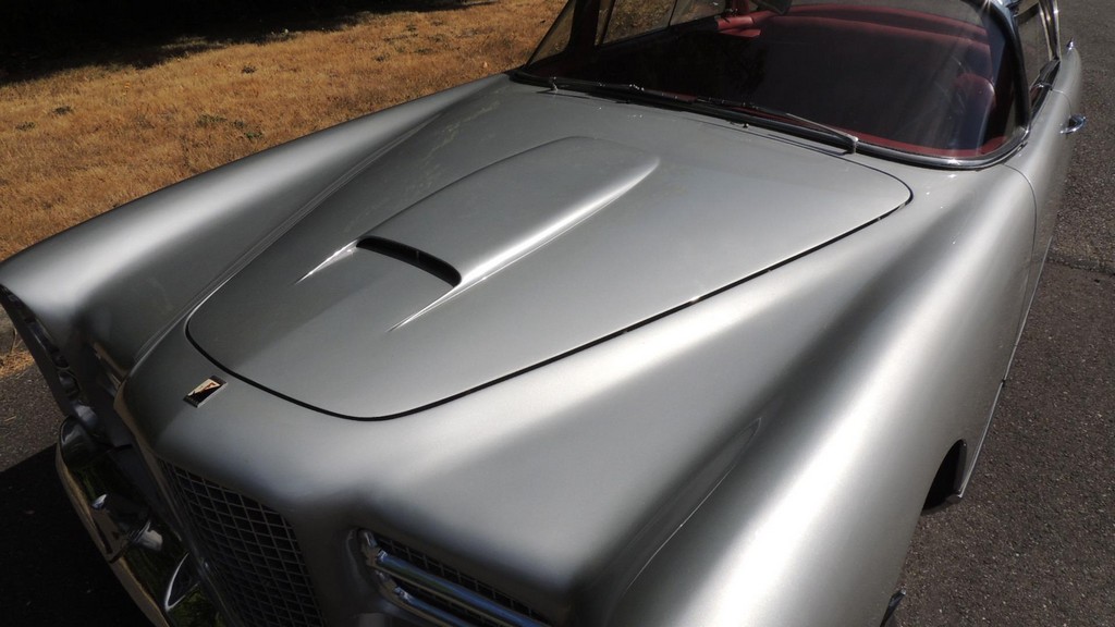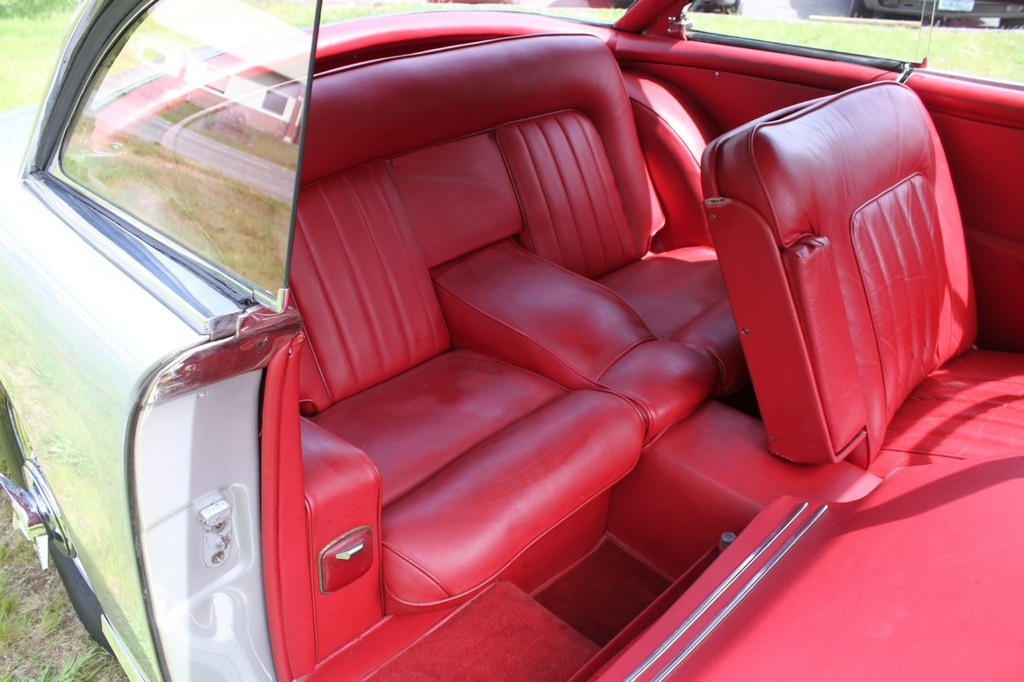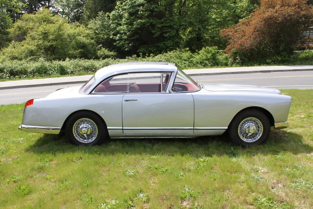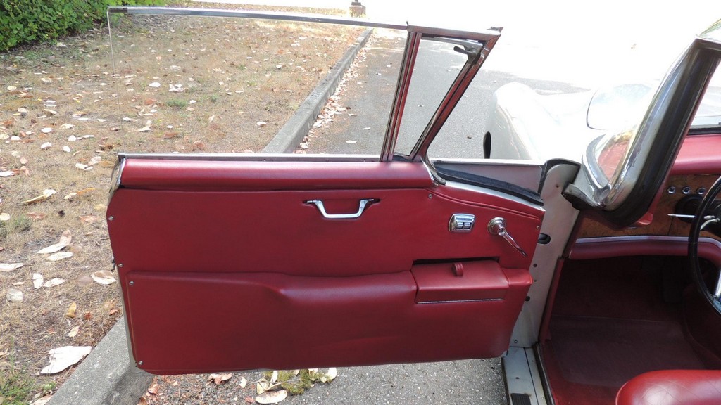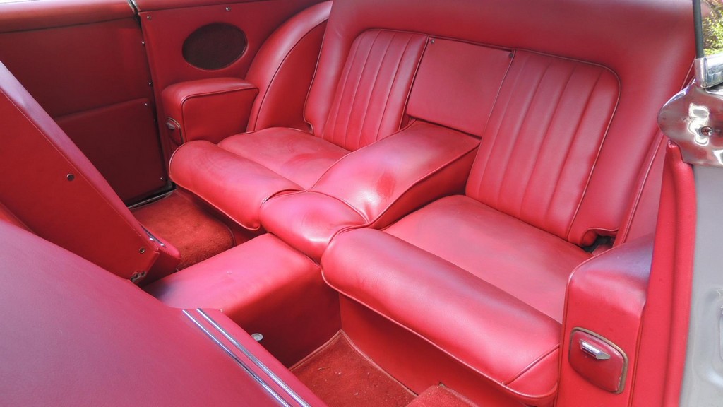 Finished in elegant gray, the coupe’s dramatic presence is defined by its wrap-around windshield, pillarless side glass, and sculpted body lines that embody mid-century European design. Knock-off wire wheels add a sporting touch, while the retractable sunroof enhances the grand touring experience with open-air versatility. Classic drum brakes reflect the car’s period-correct engineering.