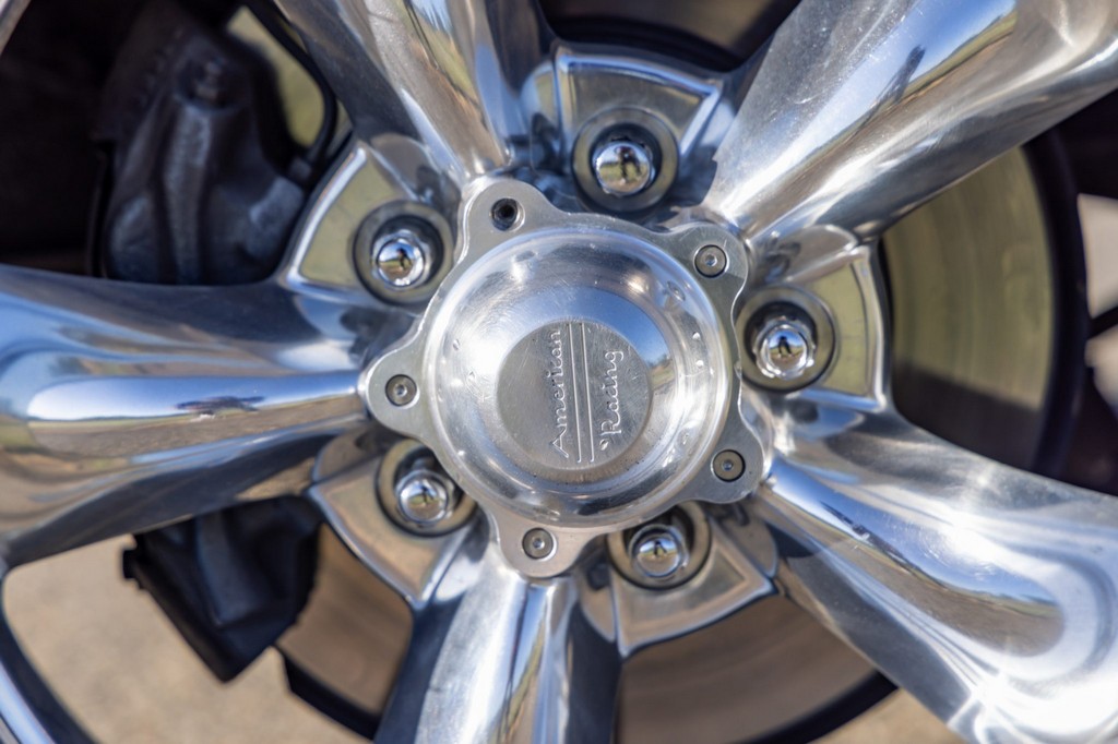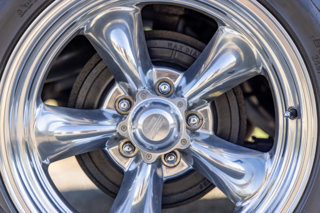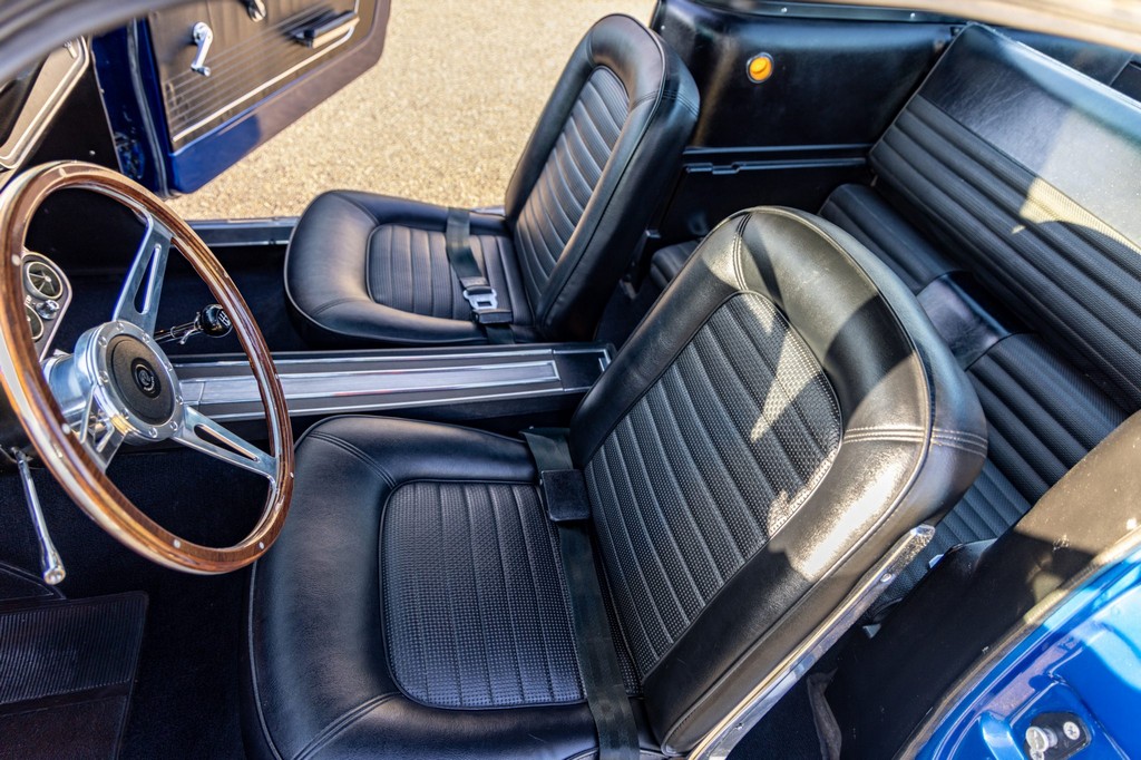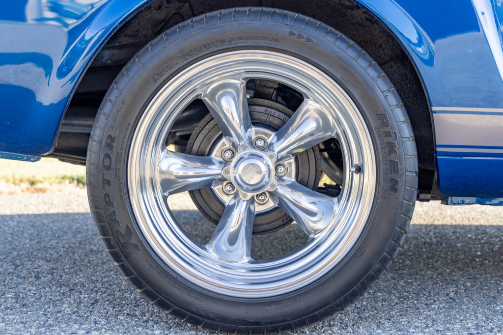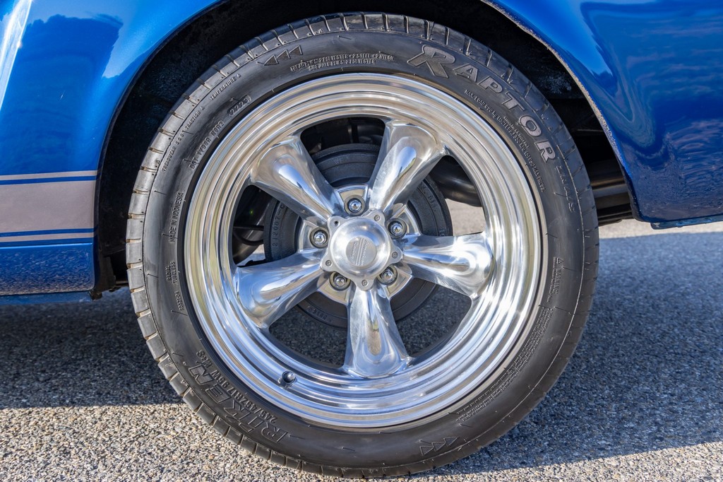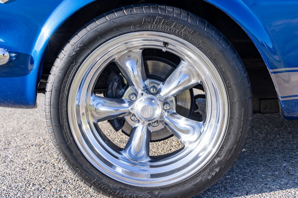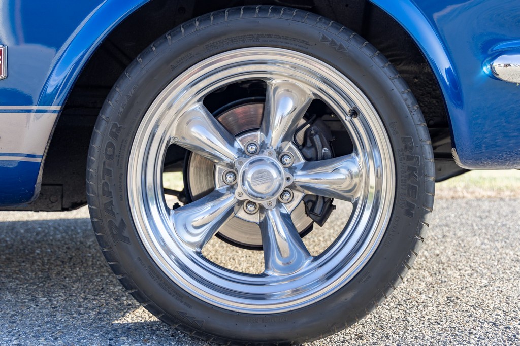 The car rides on 17″ American Racing Torq Thrust wheels, giving it an aggressive stance while maintaining classic muscle car appeal. A power brake conversion and Borgeson power steering system provide confident control, while export braces add rigidity. The car features GT-style exterior trim, dual exhaust, and metallic blue paint accented by silver racing stripes, highlighting its performance pedigree.