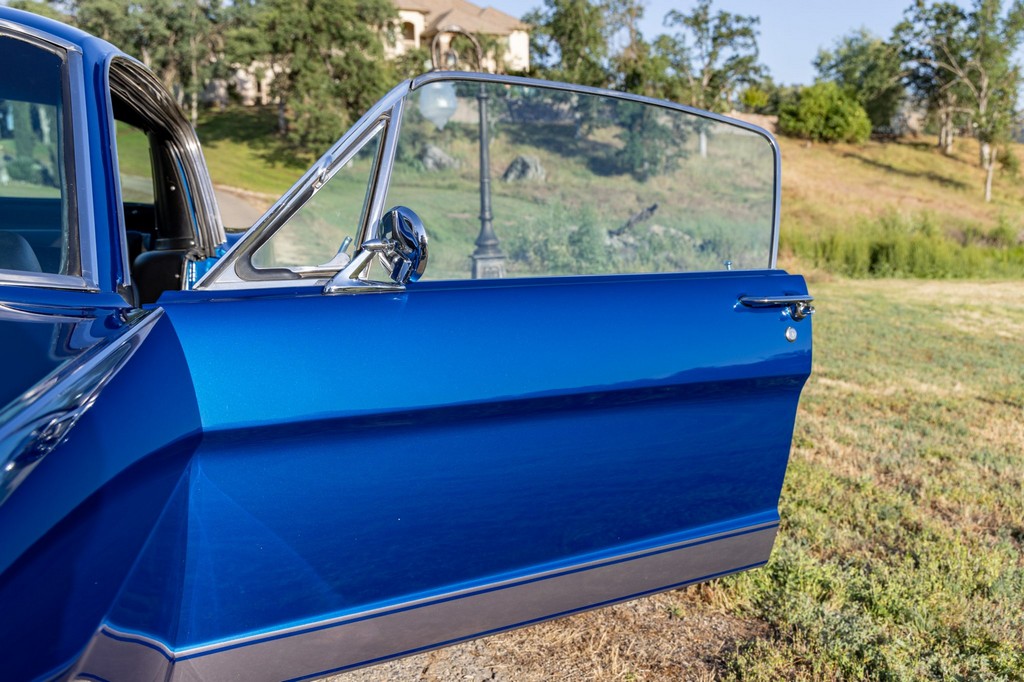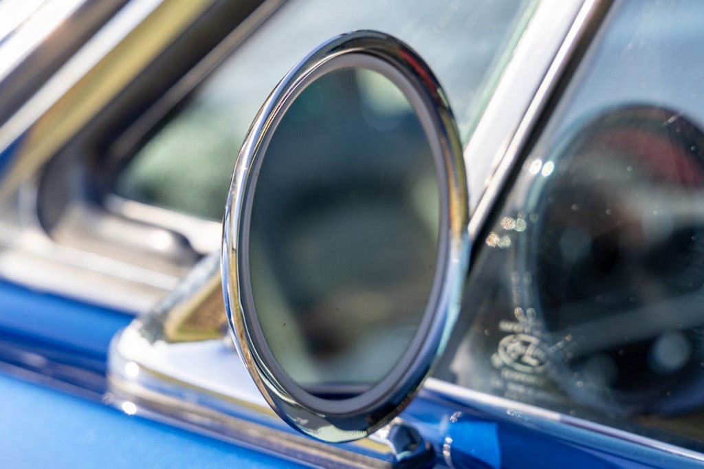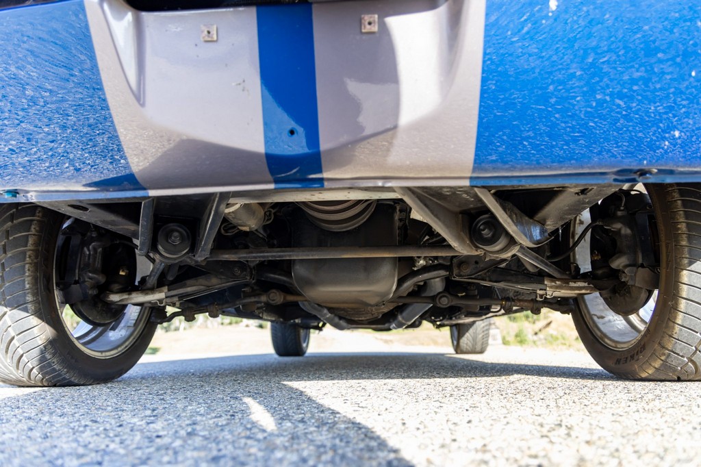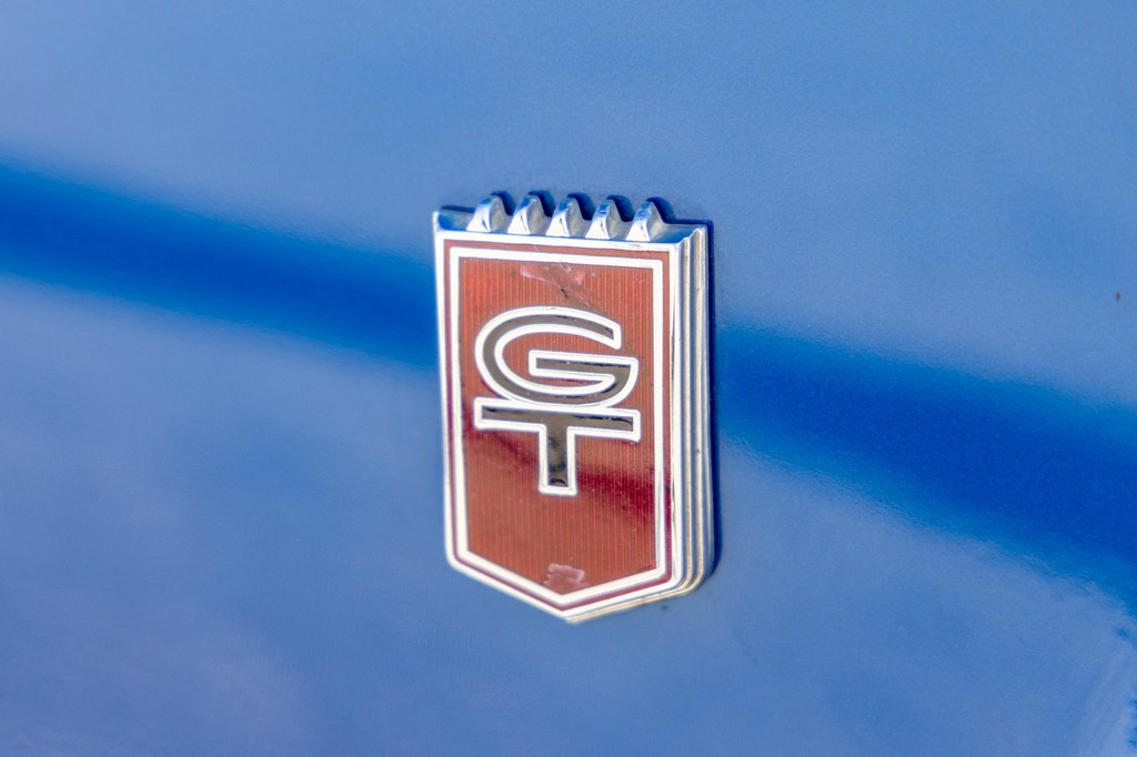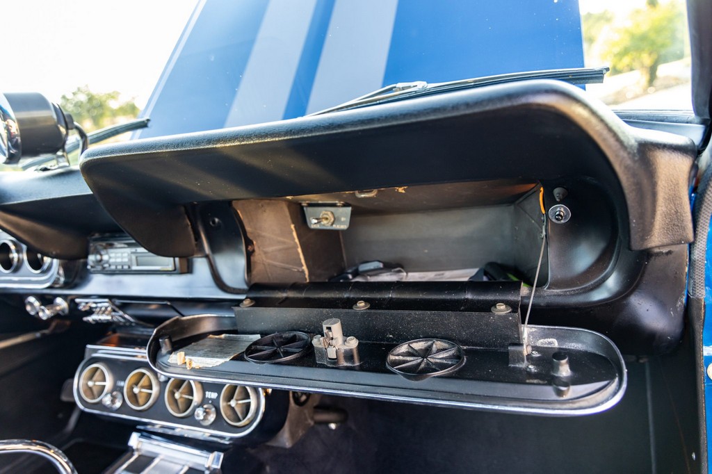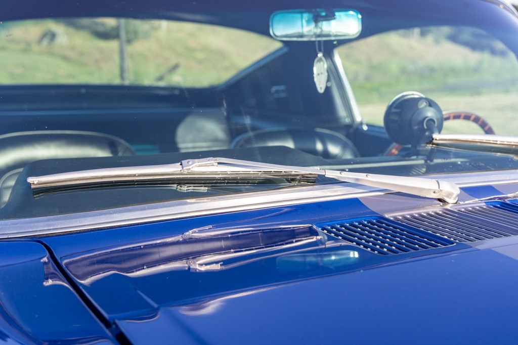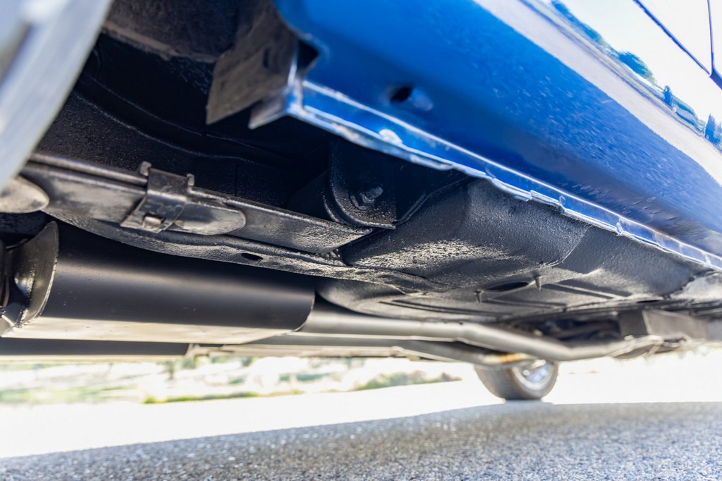 The car rides on 17″ American Racing Torq Thrust wheels, giving it an aggressive stance while maintaining classic muscle car appeal. A power brake conversion and Borgeson power steering system provide confident control, while export braces add rigidity. The car features GT-style exterior trim, dual exhaust, and metallic blue paint accented by silver racing stripes, highlighting its performance pedigree.
