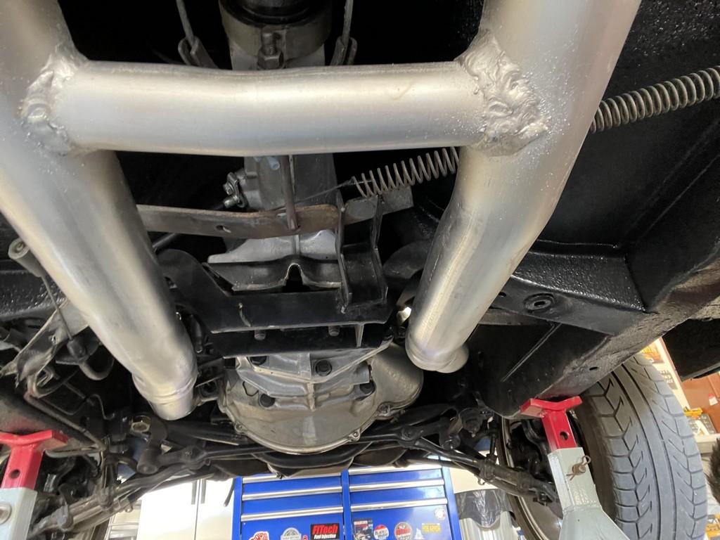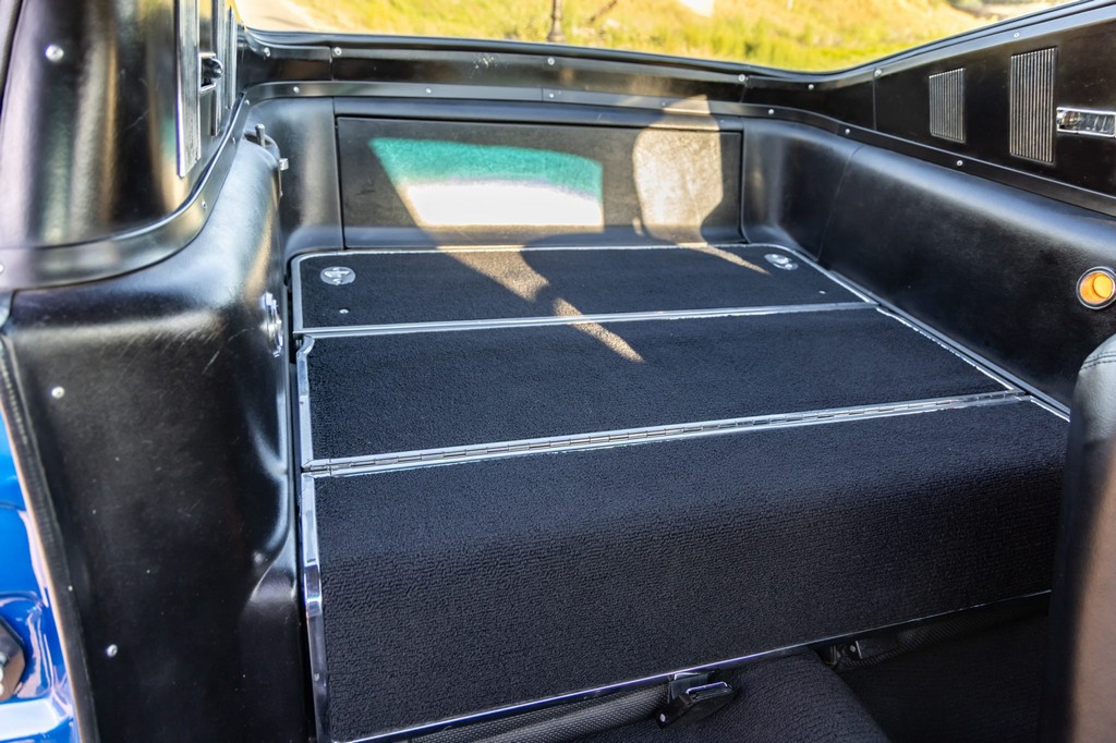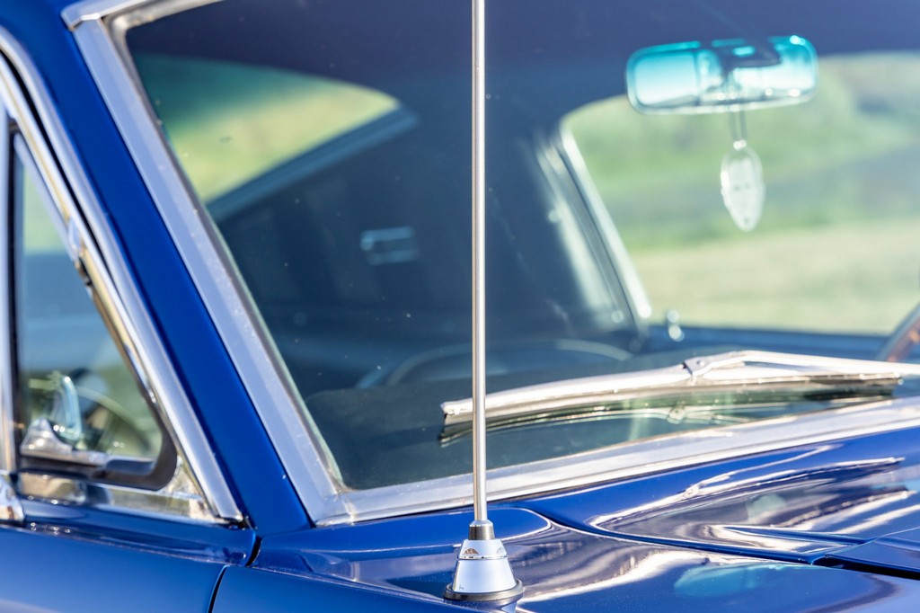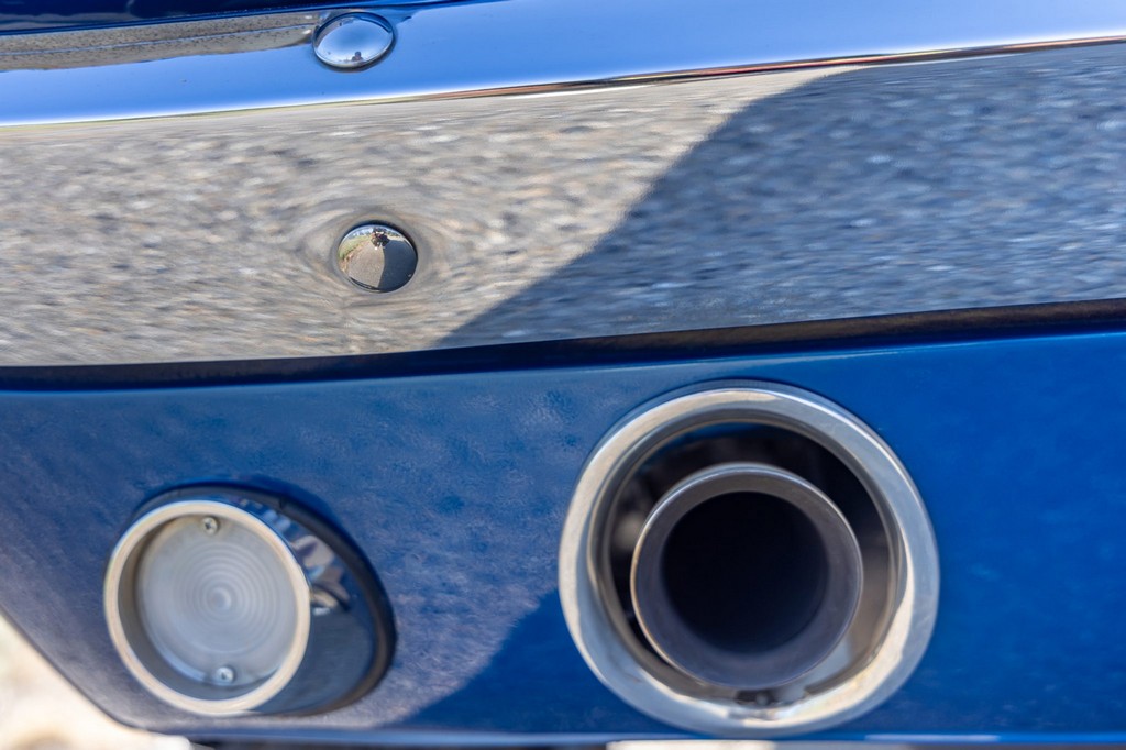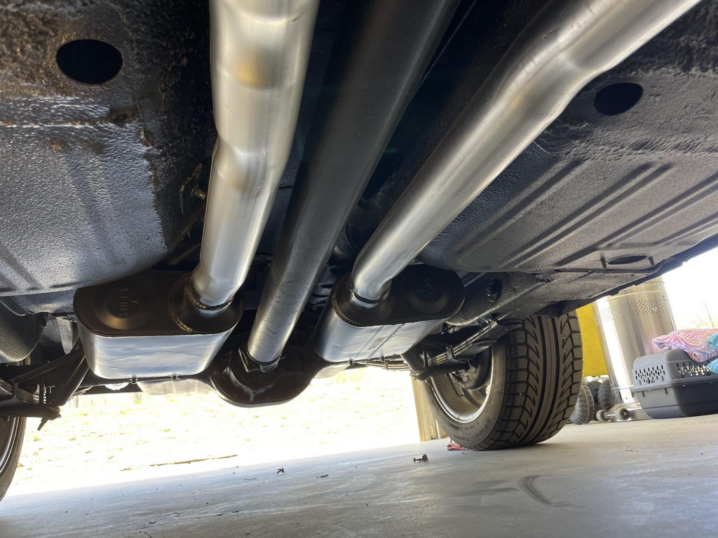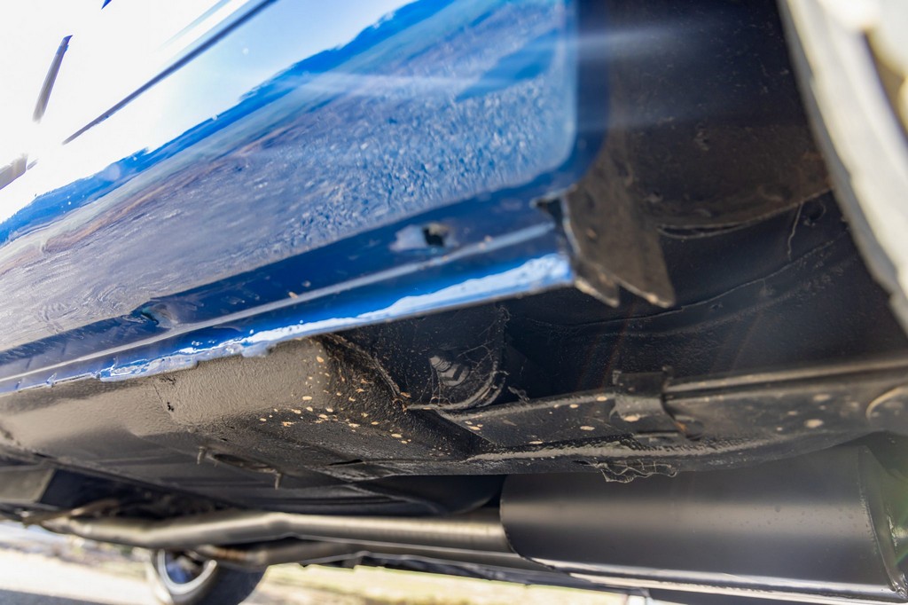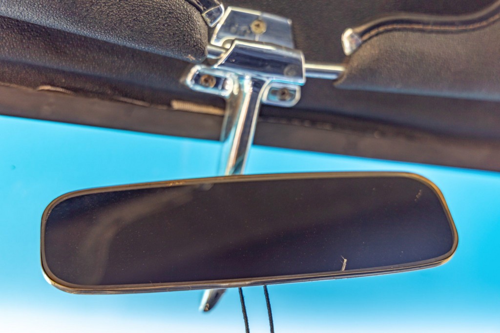 The car rides on 17″ American Racing Torq Thrust wheels, giving it an aggressive stance while maintaining classic muscle car appeal. A power brake conversion and Borgeson power steering system provide confident control, while export braces add rigidity. The car features GT-style exterior trim, dual exhaust, and metallic blue paint accented by silver racing stripes, highlighting its performance pedigree.