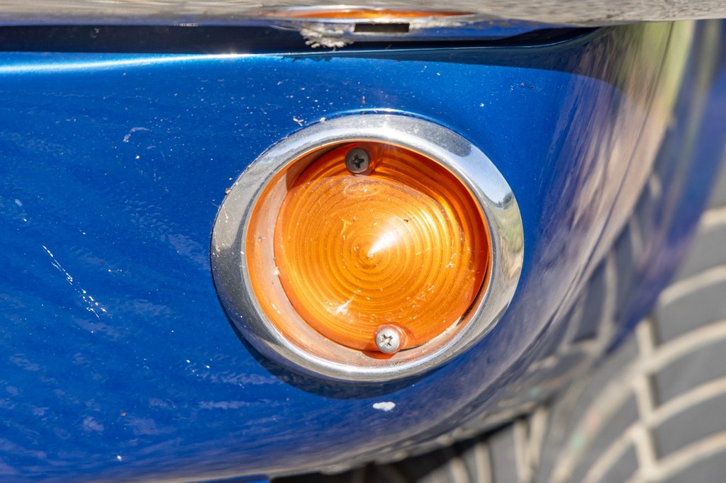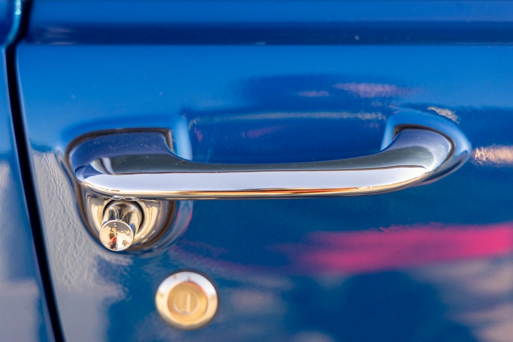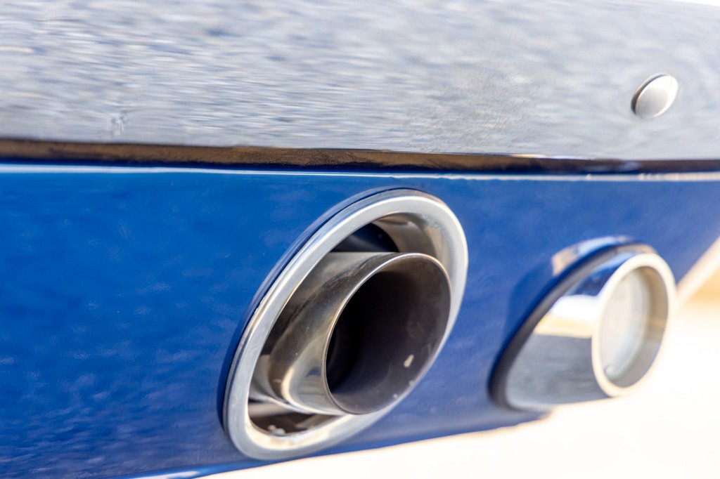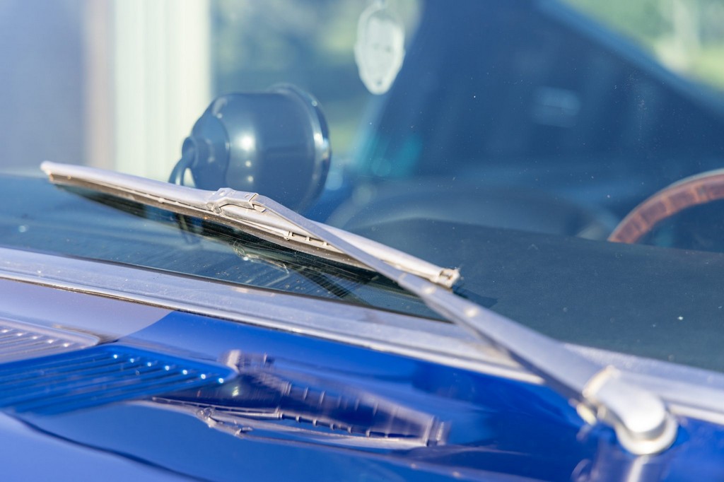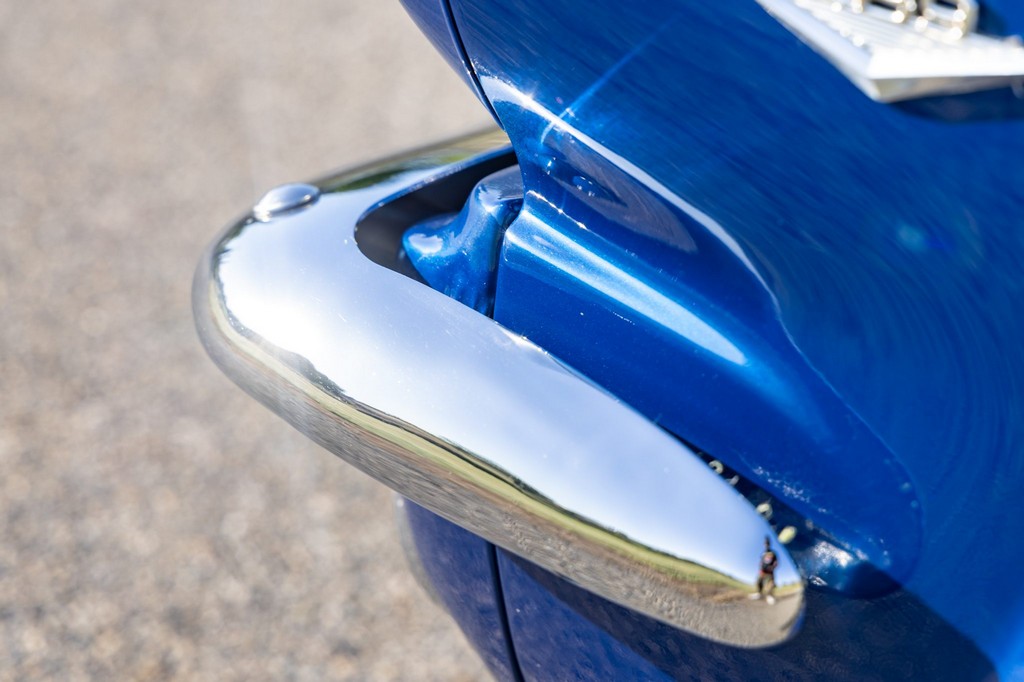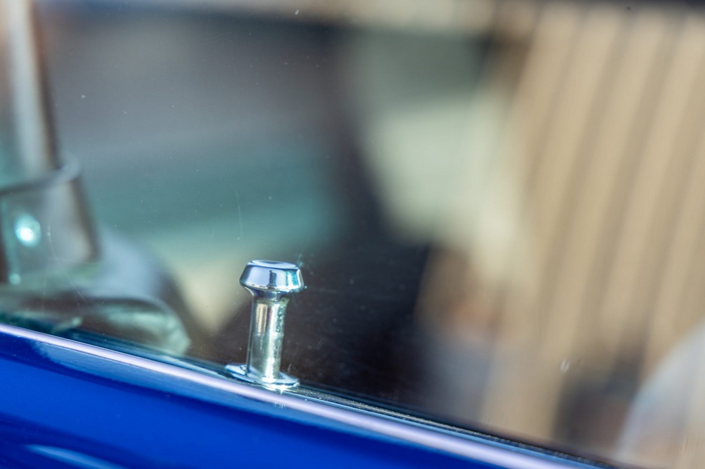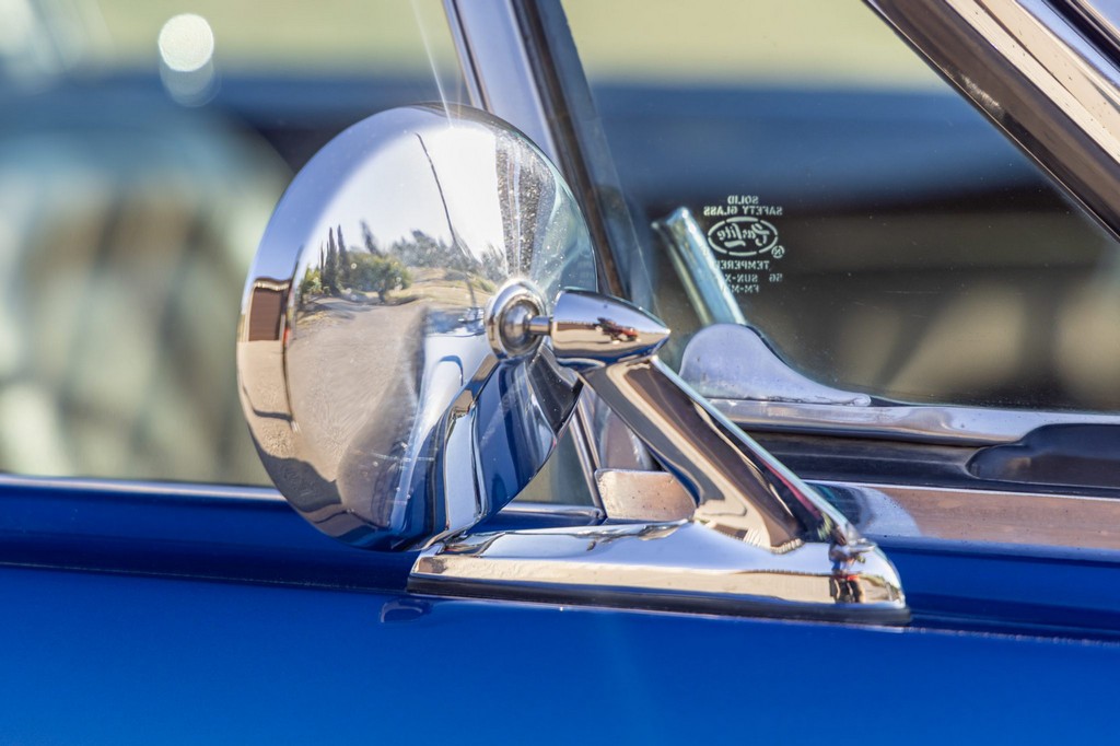 The car rides on 17″ American Racing Torq Thrust wheels, giving it an aggressive stance while maintaining classic muscle car appeal. A power brake conversion and Borgeson power steering system provide confident control, while export braces add rigidity. The car features GT-style exterior trim, dual exhaust, and metallic blue paint accented by silver racing stripes, highlighting its performance pedigree.