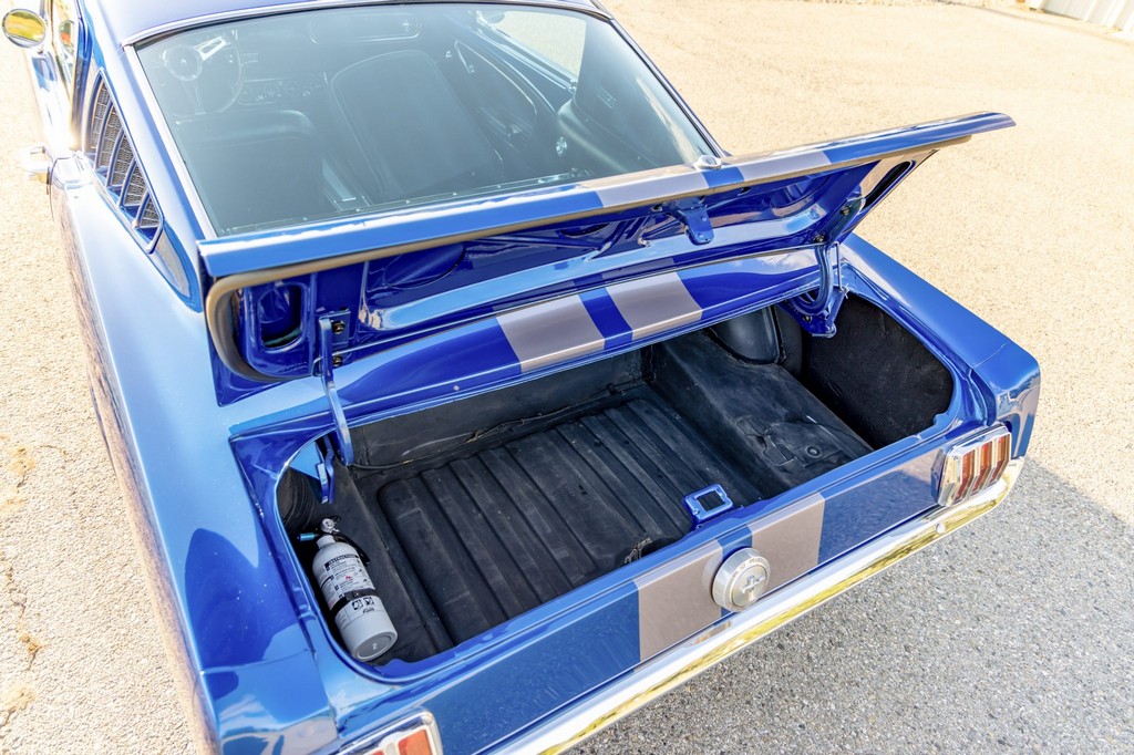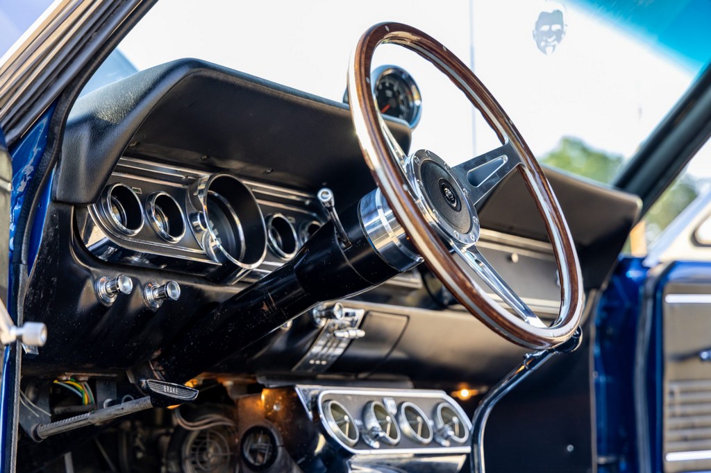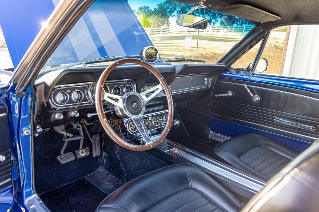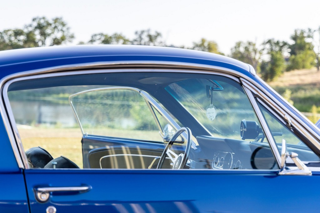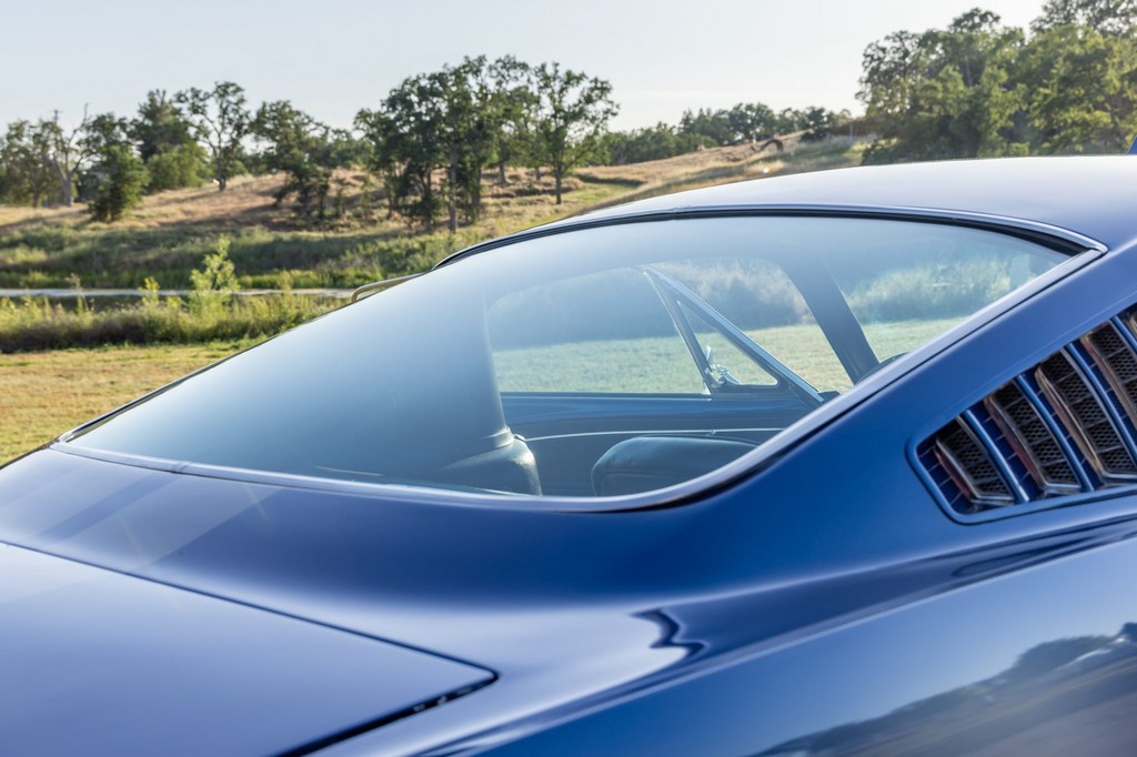 Inside, the fastback features bucket seats, an Alpine head unit, and classic Mustang-style instrumentation. The cabin balances period-correct details with subtle modern upgrades for comfort and usability.