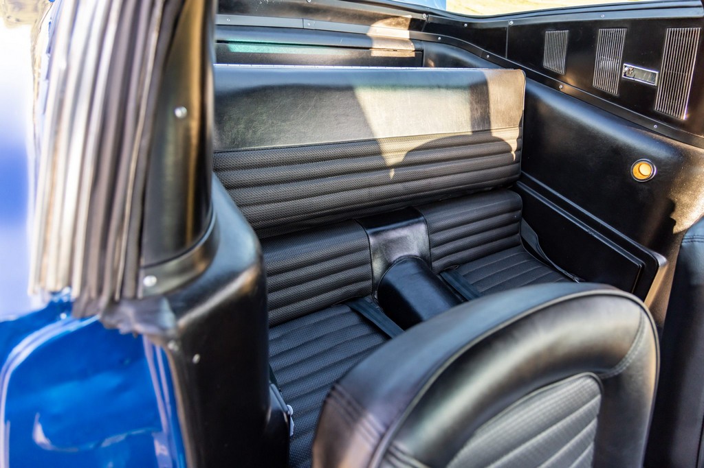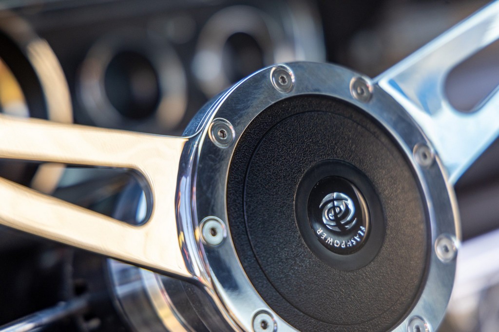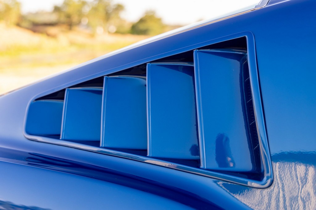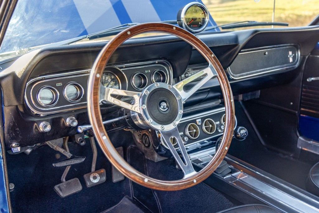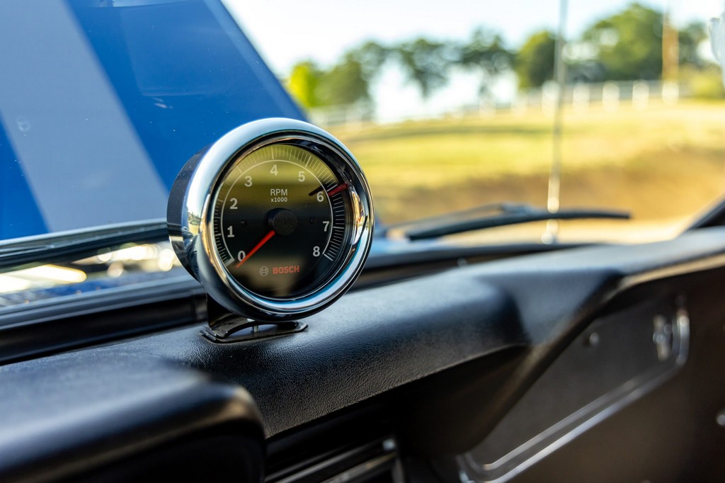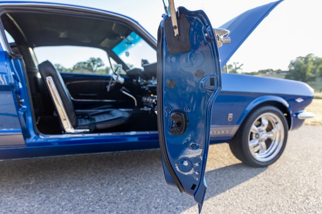 Inside, the fastback features bucket seats, an Alpine head unit, and classic Mustang-style instrumentation. The cabin balances period-correct details with subtle modern upgrades for comfort and usability.
