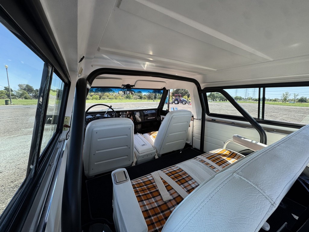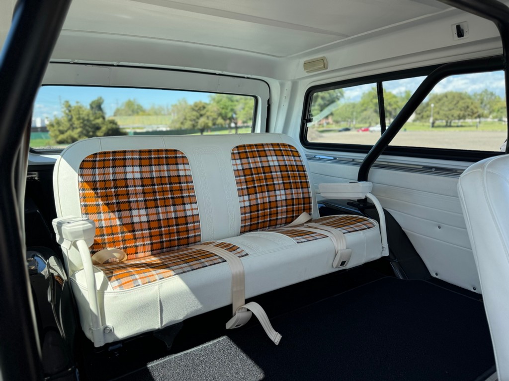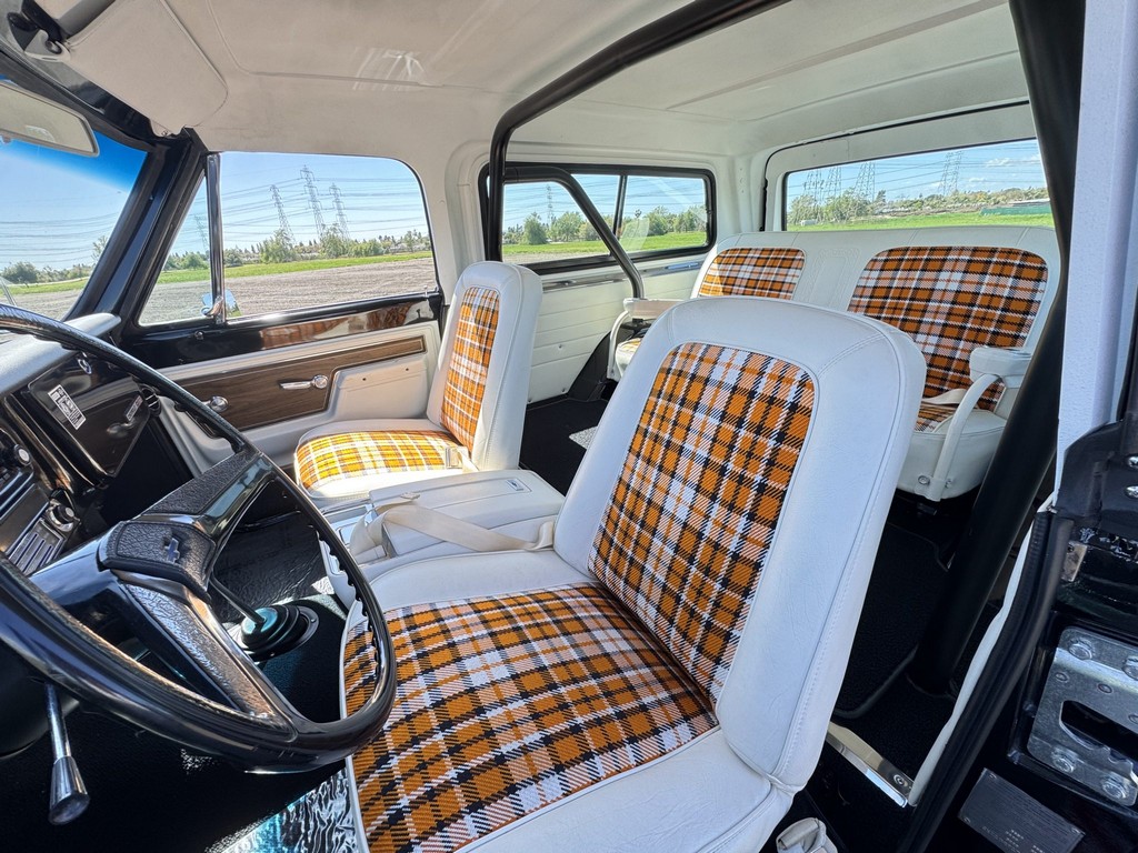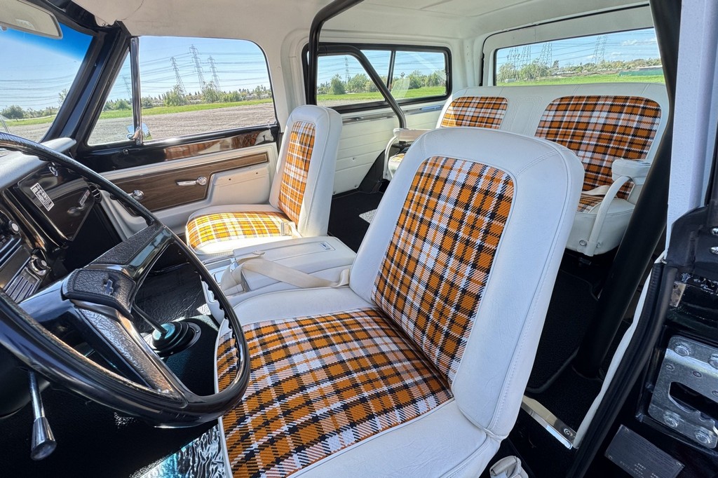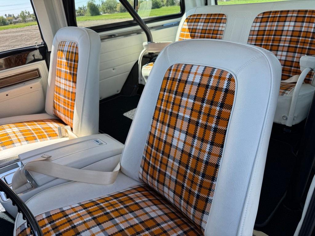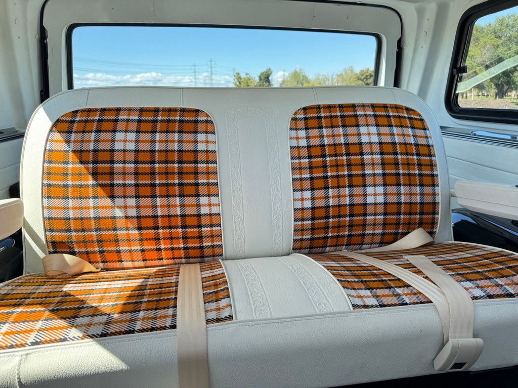 Inside, the cabin was retrimmed in Highlander white and orange plaid upholstery, perfectly capturing the 1970s vibe. Comfort and functionality are enhanced with Kilmat sound-deadening material, a RetroSound Bluetooth-capable radio, a refurbished center console, and a custom audio system with dual rear cargo-area speakers. The air conditioning compressor has been rebuilt, though the system requires servicing.
