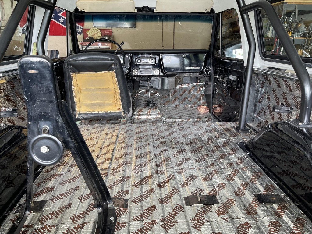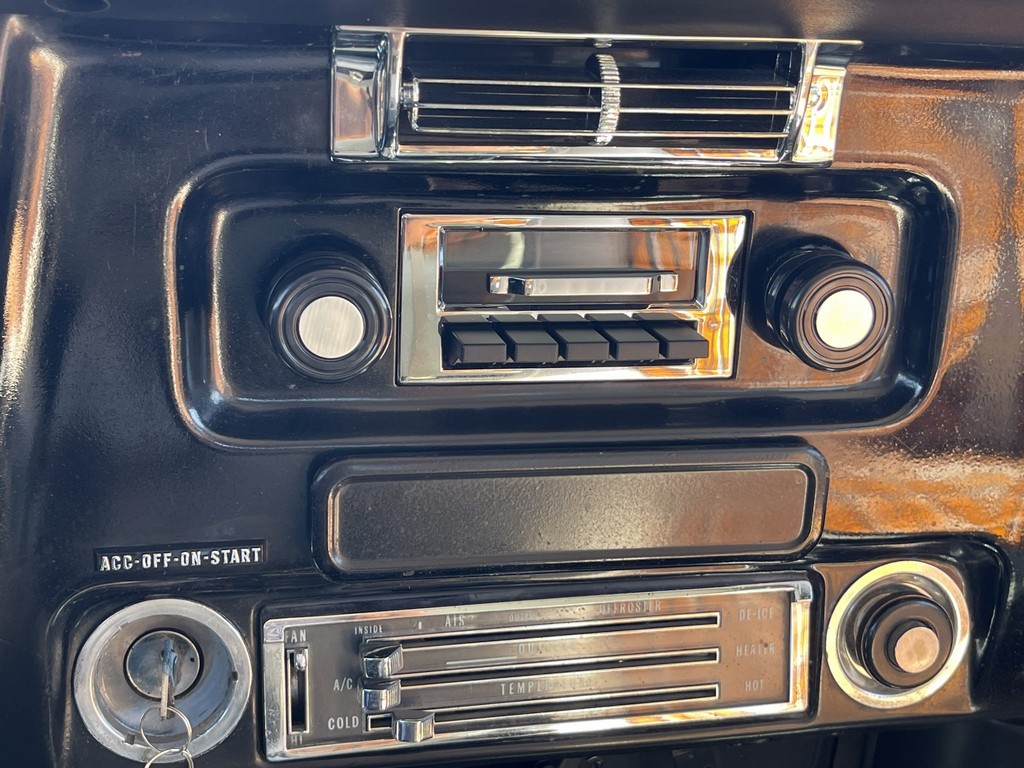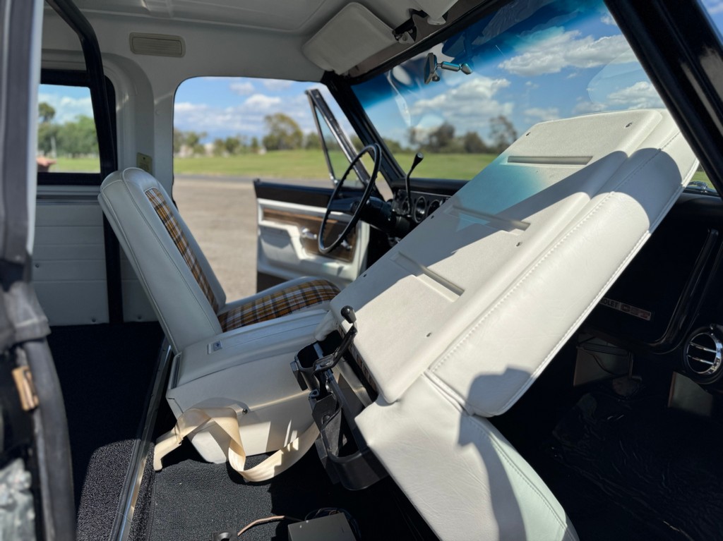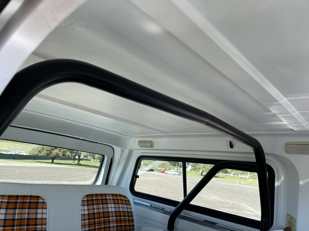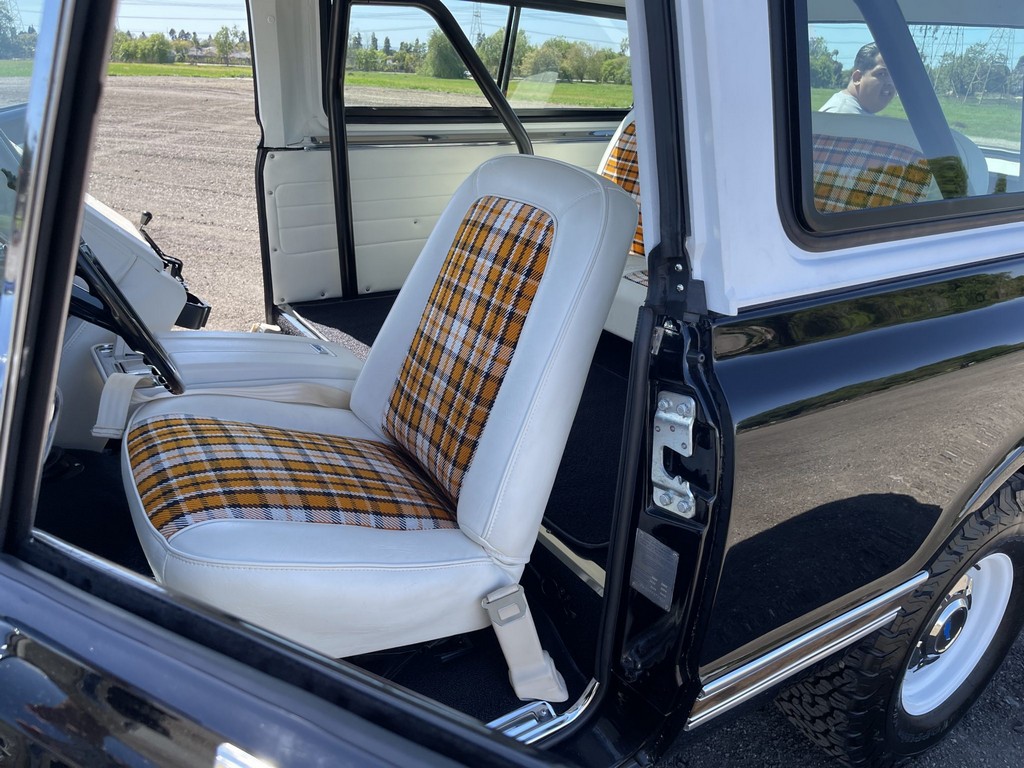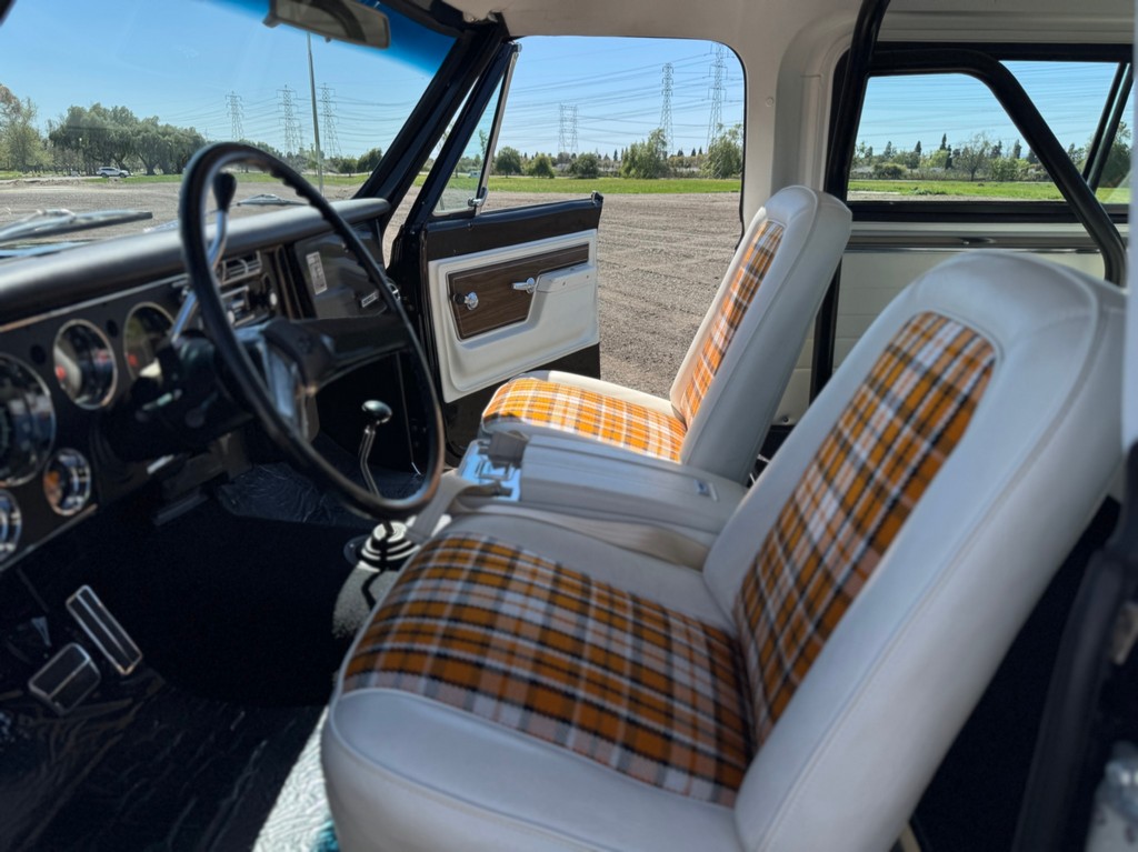 Inside, the cabin was retrimmed in Highlander white and orange plaid upholstery, perfectly capturing the 1970s vibe. Comfort and functionality are enhanced with Kilmat sound-deadening material, a RetroSound Bluetooth-capable radio, a refurbished center console, and a custom audio system with dual rear cargo-area speakers. The air conditioning compressor has been rebuilt, though the system requires servicing.
