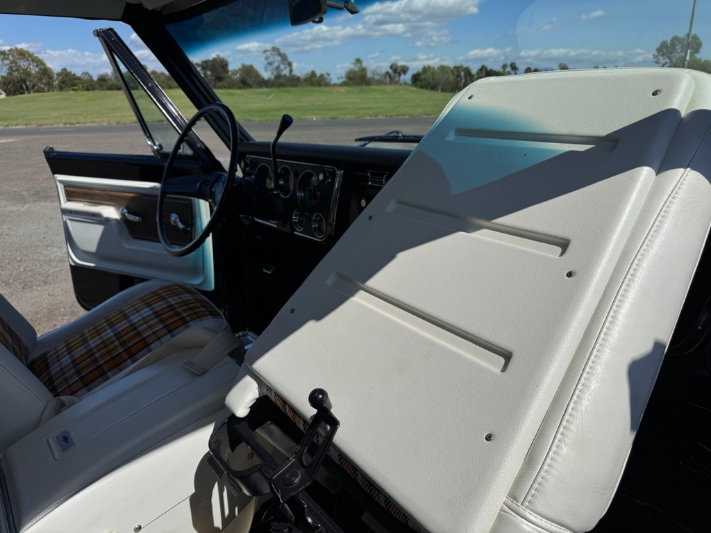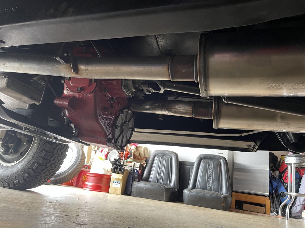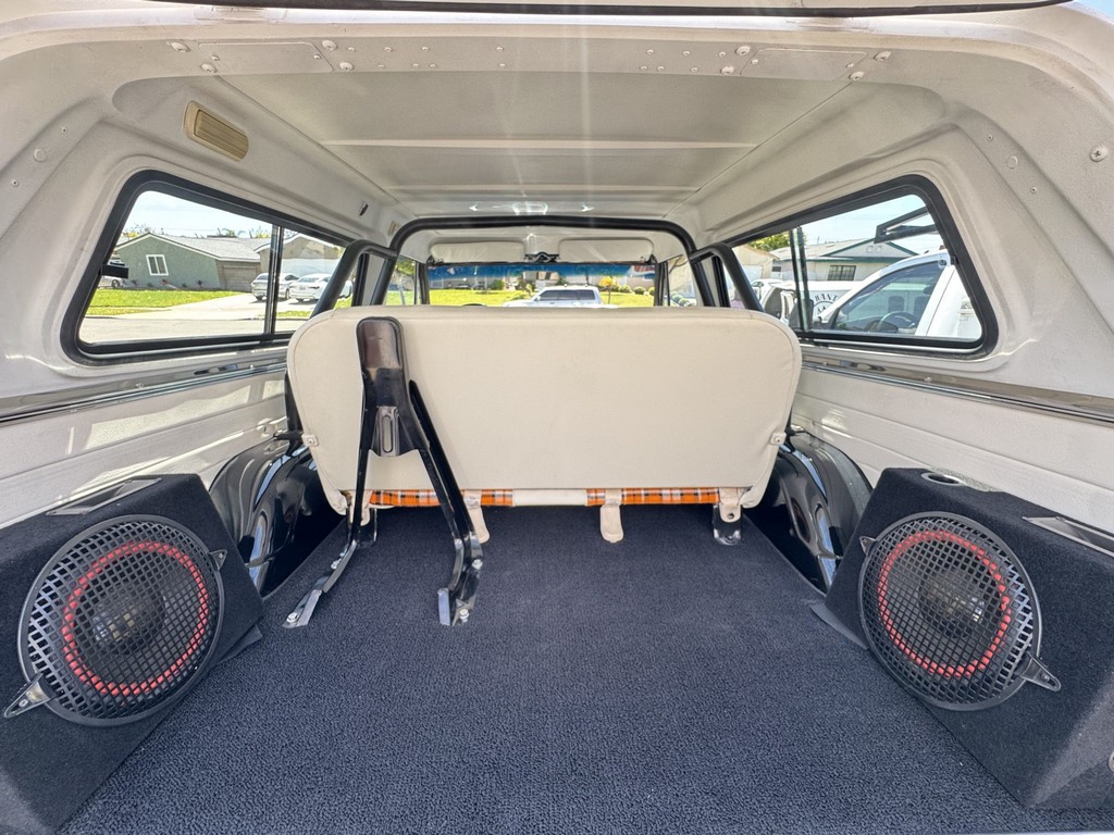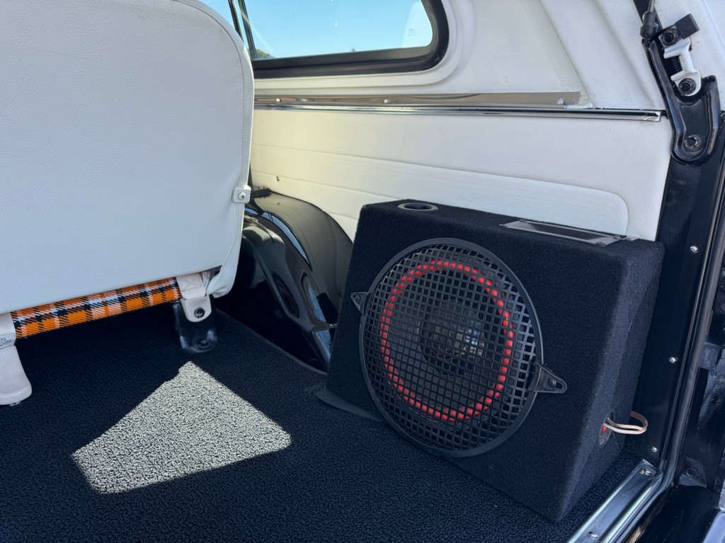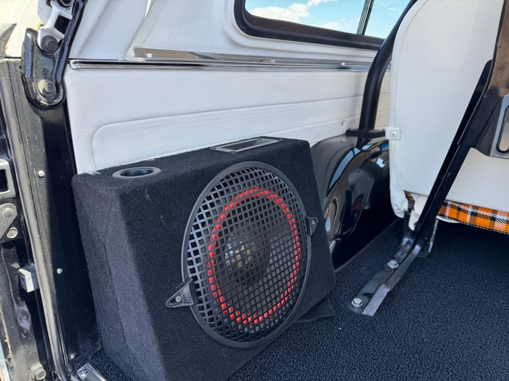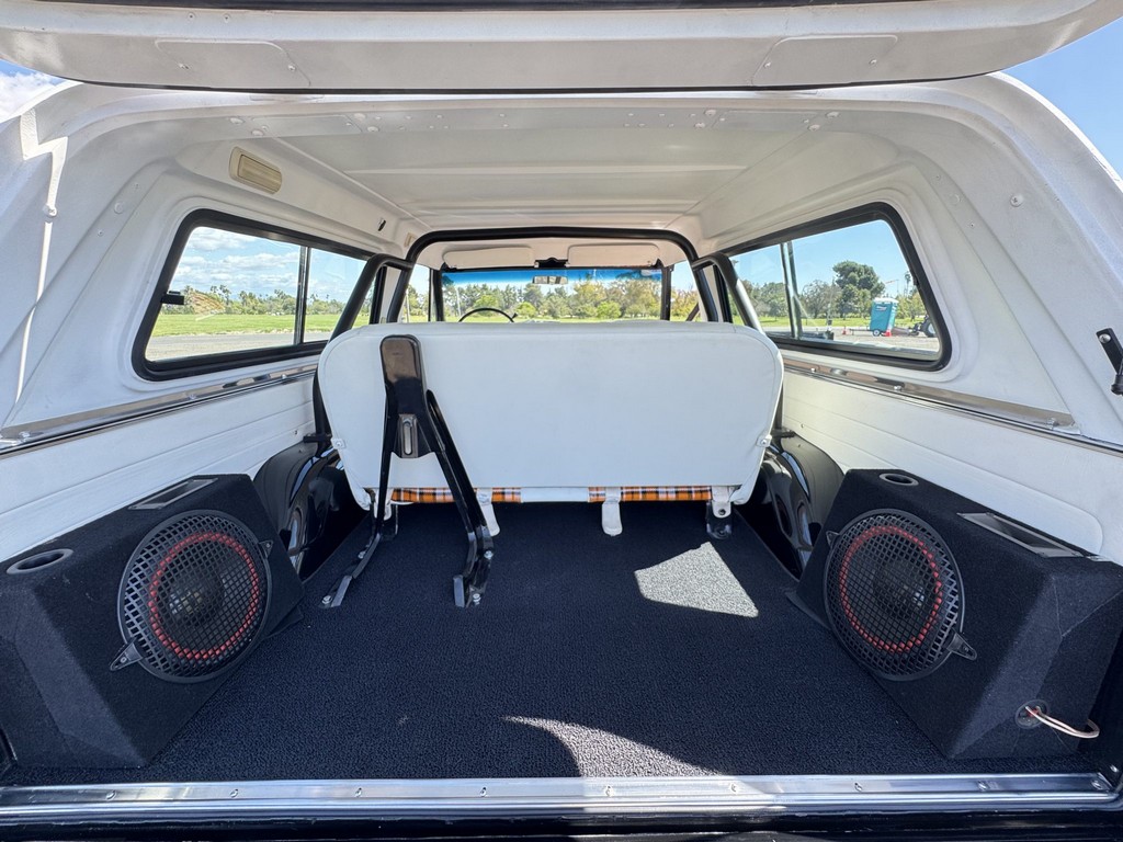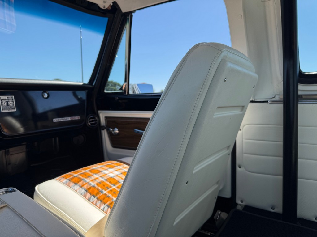 Inside, the cabin was retrimmed in Highlander white and orange plaid upholstery, perfectly capturing the 1970s vibe. Comfort and functionality are enhanced with Kilmat sound-deadening material, a RetroSound Bluetooth-capable radio, a refurbished center console, and a custom audio system with dual rear cargo-area speakers. The air conditioning compressor has been rebuilt, though the system requires servicing.